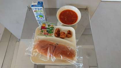 今日のメニューは、 一口トンカツ・ミネストローネ・ 豆こんぶ・ミルク・パン です。 いただきます。