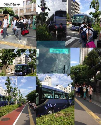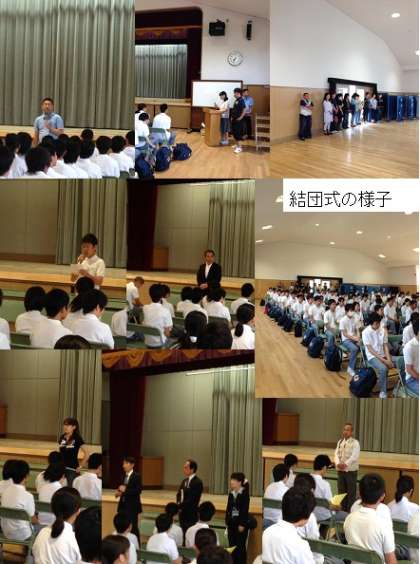 早い生徒は、7時15分の集合時間より30分も早く集まっていました。講堂で結団式を行い、その後、たくさんの保護者の見送りを受けながらの出発でした。