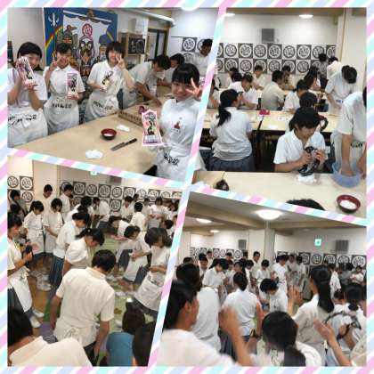 今度は粉から塩水を加えてこねていきます。 音楽に合わせて足踏みで作ります!
