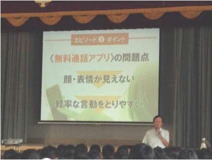 講師は通信大手KDDIから専門家をお招きしました。動画など映像も交えて、スマートフォンにまつわる3つのエピソード(写真投稿による社会的トラブル/無料通話アプリをめぐる友人関係のトラブル/SNSを通じて知り合った相手と会う危険性)をわかりやすく紹介していただきました。