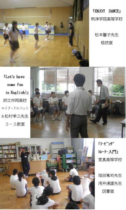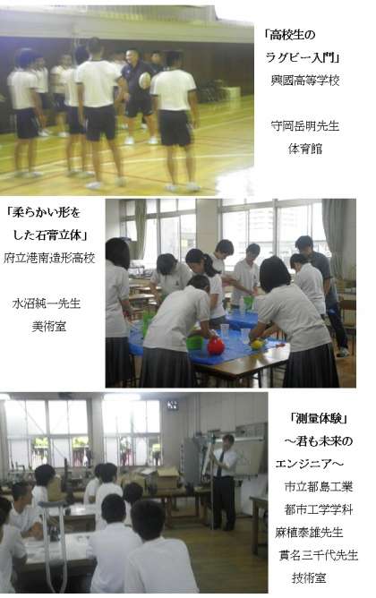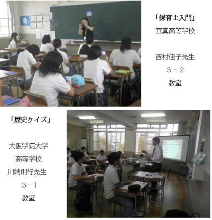 高校の先生をお招きして、高校授業体験を実施しました。今年度協力していただいた学校は、大阪学院大学高等学校、宣真高等学校、興國高等学校、明浄学院高等学校、府立市岡高等学校、市立都島工業高等学校、府立港南造形高等学校の7校8コースを開設していただきました。