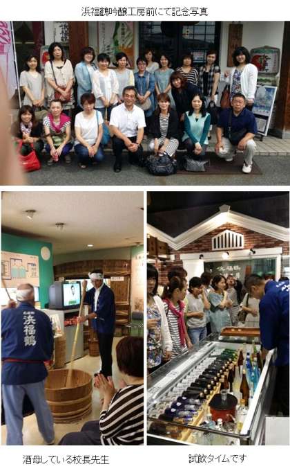 8時45分に、中学校正門前から小型バスで、神戸方面に向かいました。9時30分位は、第1目的地「浜福鶴吟醸工房」に到着し記念写真。見学では「酒母」を体験、そして「試飲」。とても楽しそうですね(笑)