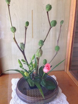 火曜日は、仁平さんが玄関に活花を飾りに来てくれます。今週の活花は「イガナス」、「バラ」、「ユリ」です。