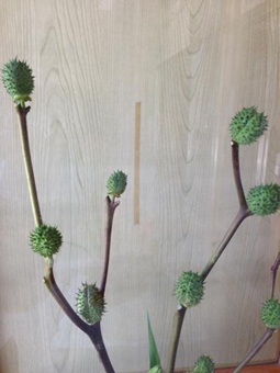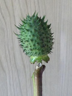 とげのある種子が面白く、花材としてよく使われるそうです。茎がナスに似ていて、イガイガですので、姿から「イガナス」と言っているみたいですが、「ダチュラ」の実なんです。