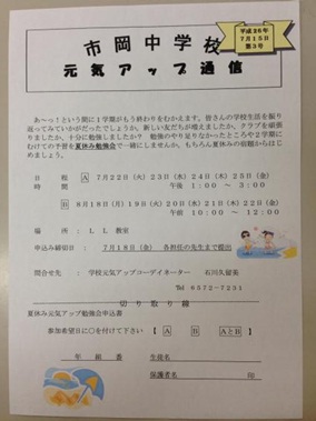 いよいよ、夏休みをむかえます。元気アップ事業では、7月22〜25日、8月18〜22日の2回にわたり、夏休み勉強会を実施します。