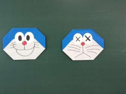 折り紙でドラえもんをつくります。文部科学省が後援する「保育技術検定」とは何かを学び実技を体験してもらいます。