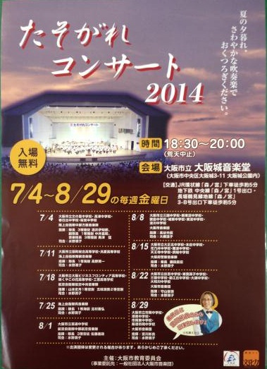7月4日〜8月29日の毎週金曜日、午後6時30分から大阪城音楽堂で「たそがれコンサート2014」が開催しています。8月29日最終回に本校吹奏楽部が出場します。入場無料ですので、よければご家族とご一緒に黄昏に行きませんか。