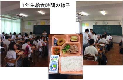 写真は本日の給食メニュー(豚肉のりんごソースグリル・ボイルブロッコリー・いかリングフライ・さつまいものレモン風味煮・にんじんとアスパラのサラダ・米飯・牛乳)と1,2組の様子です。