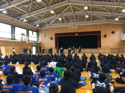 港中学校、伝統の部活紹介がスタートです。まずは吹奏楽部の素晴らしい演奏です。
