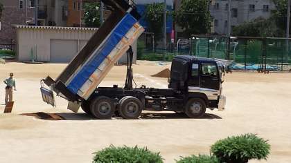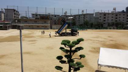 本日7月12日(金)10トントラックが山土を沢山積んでグランドにばら撒いてくれました。午後から野球部、サッカー部、ラグビー部、テニス部が整地を一生懸命にしました。