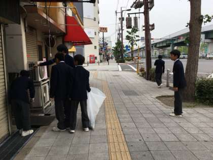 サッカー部、バレー部、陸上部が朝から校内や地域の清掃に取り組んでいます。