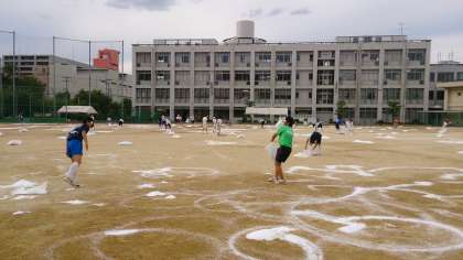 今日は多くの先生が研修のため、活動している部活動(テニス・バレー・サッカー・ラグビー部)で「にがり(塩化カルシウム)」を巻きました。