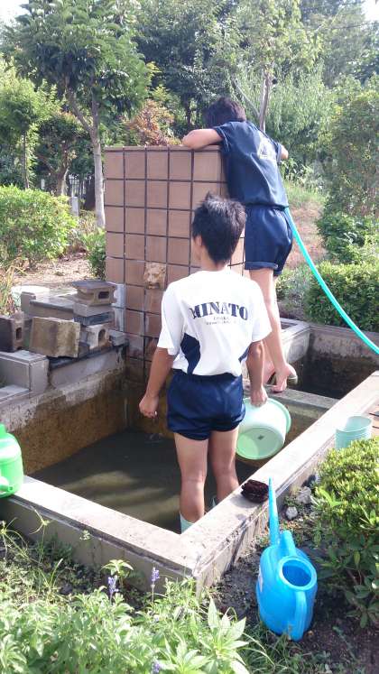 ライオンの噴水を昨日に引き続き、野外活動部が掃除をしてくれています。
