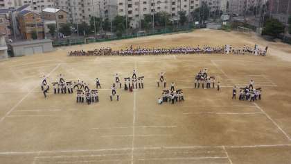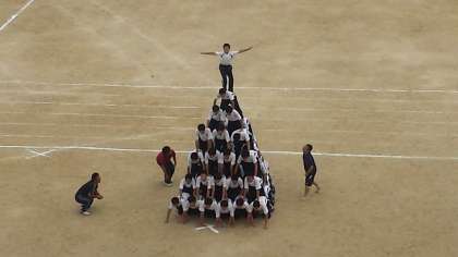 集団行動の見せ場が始まりました。男子の七段ピラミッド最上段は、サーファーのポーズ