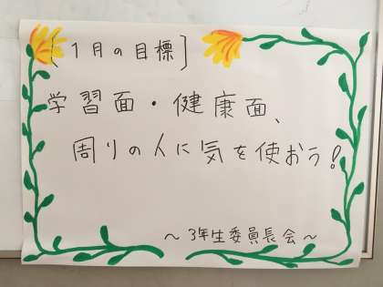 その後、委員長会から今月の目標についての報告がありました。今月の目標は「学習面・健康面、周りの人に気を使おう!!」です。受験はチーム戦で、クラスの雰囲気なども非常に重要です。入試が近づいてきましたが、自分のことだけでなく周りのみんなのことを考えて行動するようにしましょう!!