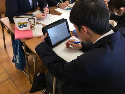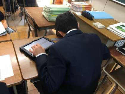 タブレットを使って調べ物をする人、新聞を書いたりまとめたりする人など役割分担をして行っています。