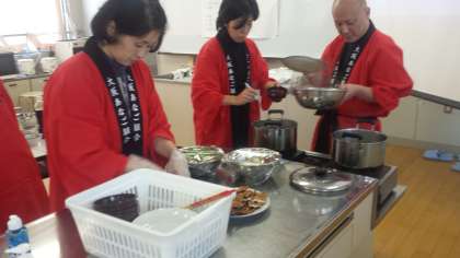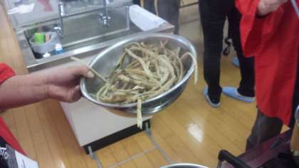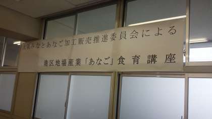 二年生を対象に、アナゴの料理方法を等を学びました。実技指導には、アシスタントの方を含めて六人の方に来ていただきました。