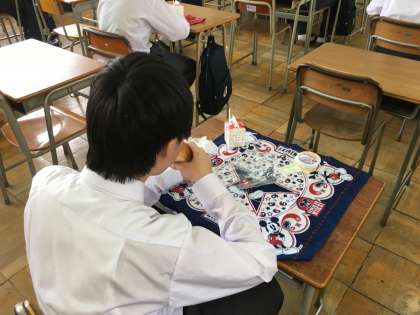 感染症予防のため、行儀よく前を向いて静かに食べていました。