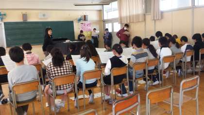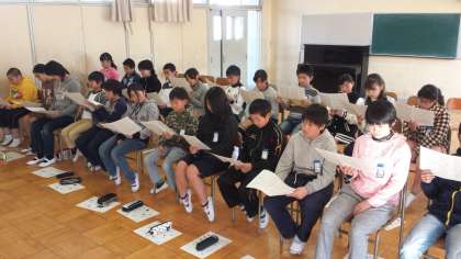 音楽…「翼をください」「マイバラード」を合唱しました。口の開け方によって声の大きさも違う。基本を学びました。