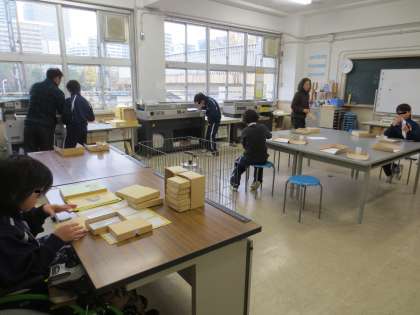 ノートや連絡帳を作るもとを印刷機でたくさんプリントします。