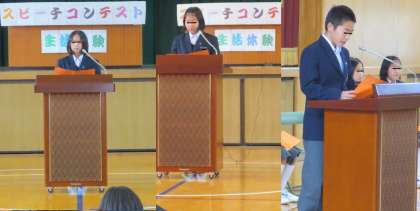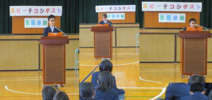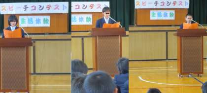 クラスの代表者3名が体育館で1年生のみんなの前で発表しました。
