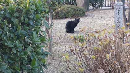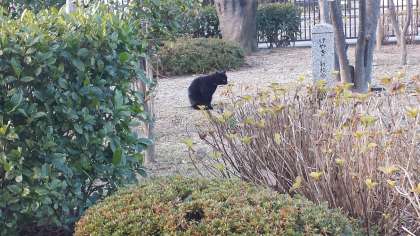クロネコとトラネコが日向ぼっこ、どちらも飼い猫と思われます。トラネコは首に鈴二個付けています。カメラが嫌いなようでした。