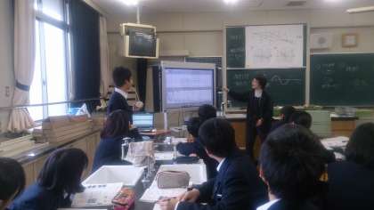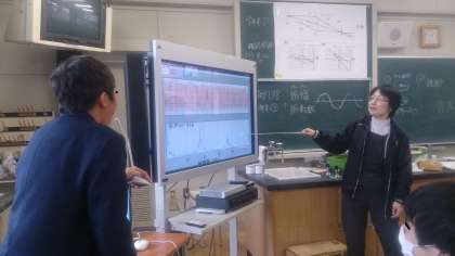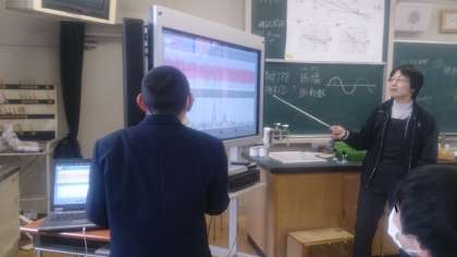 そこで、今日(26日)の授業では「波形表示ソフト」を使って「音」と「振動」のようすとの関係を調べてみました。