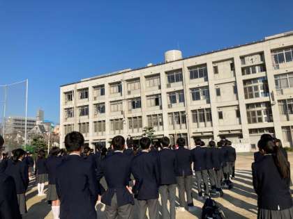 おはようございます。雲一つない晴天のもと、全校集会を行いました。