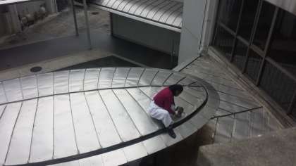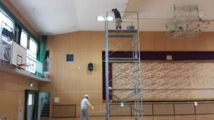 体育館の照明や天井の破損修理、本館玄関の屋根の水漏れ修理。卒業式を迎えるのに校舎の修復作業が始まりました。工事場所には近づかないようにしましょう。
