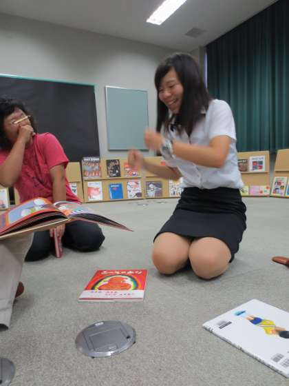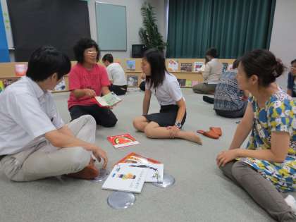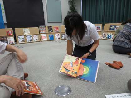 4人の小グループを作り、それぞれが気になった1冊を他の先生たちに読み合ったり、見合ったりしました。