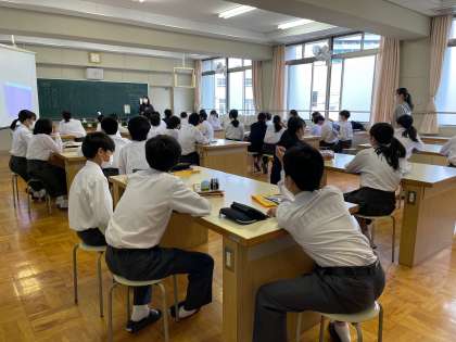 はじめて被服室で授業を行いました。教室を利用するときの注意事項を真剣に聞いています。