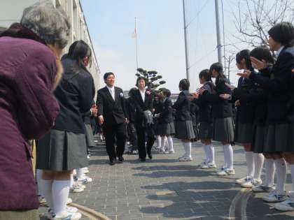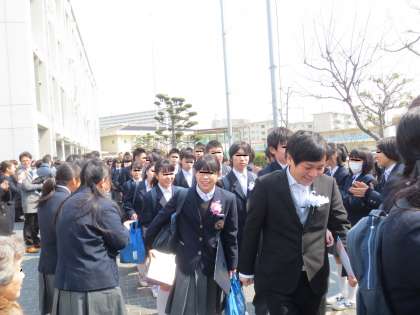 保護者のみなさまをはじめ、在校生・教職員による花道を歩き…