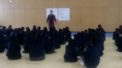 学年の先生が順番で生徒のみんなへ話をしています。