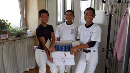 ○人命救助のお礼として、池島地域振興会町会連合会長、福寿様から野球部に飲み物