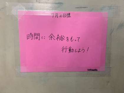 先日の生徒専門委員会で、7月の目標が「時間に余裕をもって行動しよう!」に決まりました。