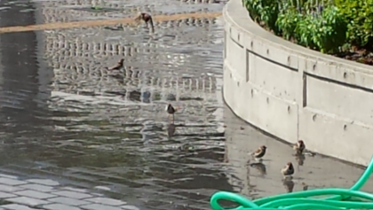 少しの水たまりが出来たところに、すずめが五〜六羽舞い降りて「水浴び」をしています。
