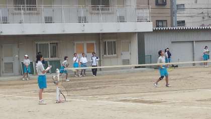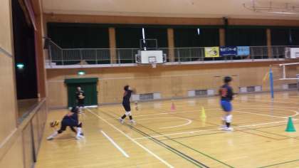 体育館では、バレーボール部。グランドでは、ソフトテニス部が港南中学校と合同練習中です。午後4時前