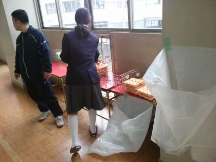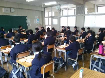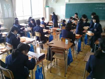 突然教室にお邪魔しました。とても静かで初々しさが伝わりました。おいしいですか?の返事は、…と様々でした。食後の食器の返却もスムーズでした。