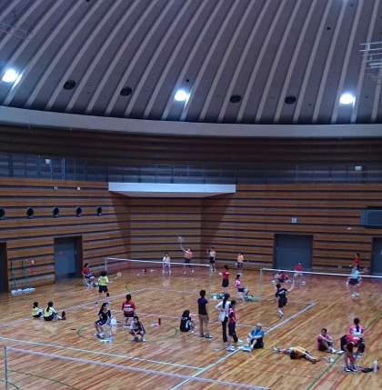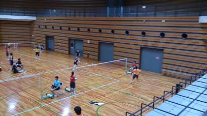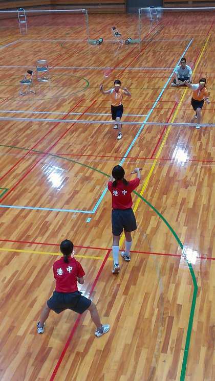 バトミントン部全員で出場している仲間へ大きな声で応援しました。