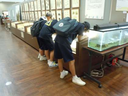 下の写真は自然史博物館の特別展「いきものいっぱい大阪湾」を見ているところです。ウミウシ、フナムシ、海藻標本など、よく観察して見学ワークシートも書きました。大阪湾にきたマッコウクジラの骨格標本もあり、クジラが陸上の動物だったなごりの後あしの骨も見れました。この特別展の案内のポスターは、職員室前に貼っています。