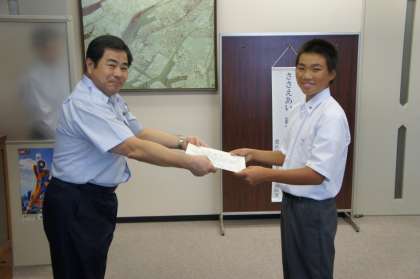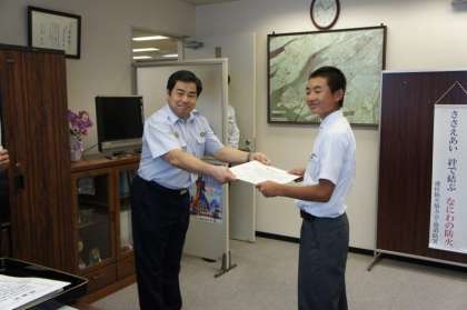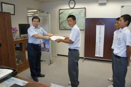先日、野球部の生徒3名が、港中の正門の前で暑さのため倒れかかっている老人を助けてくれたことに対して、港消防署長細尾様より表彰状をいただきました。