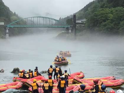ヘルメット、ライフジャケット、ウェットスーツを身にまとい、今霧がかかる吉野川で、ラフティングが始まりました。
