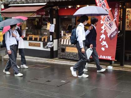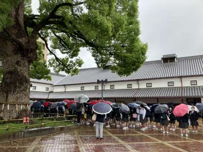 雨の中の琴平散策も終わりました。片手に傘、もう一方の手にはお土産の詰まった袋を持つ姿が見られました。