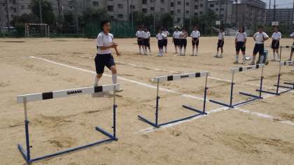 リズムよく3台のハードルを走り抜ける。練習すれば上達しました。振り上げ足を伸ばすには爪先を真上に向けよう。そして素早く踵から振り下ろす。ポイントが一杯ありますね。研究授業ご苦労様でした。