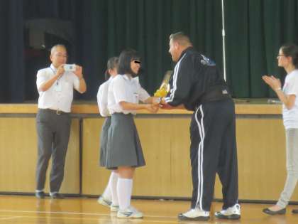 生徒・児童を代表して生徒会よりお礼のあいさつと花束を贈呈しました。