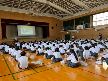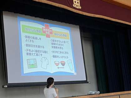 5限一、二年生がmeijiの方に来ていただき、熱中症予防について講話をしていただきました。