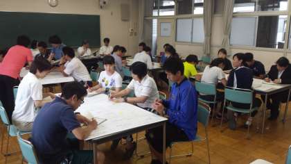 研究授業には小学校の先生も参加、本校のフレッシュメンバーも含め全員で討議を行いました。教員委員会からは、山尾教育指導員、西田主任指導主事の先生にお越しいただきご指導していただき充実した討議が展開されました。