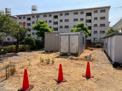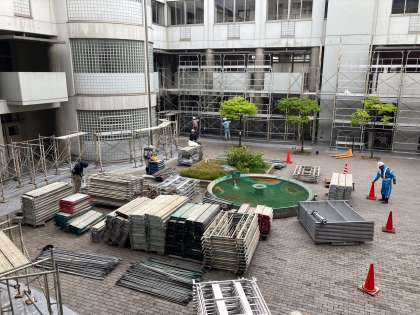 先ずは中庭面の足場設置から行われ、校舎全体が足場で覆われます。(写真中・下)また体育館前には工事関係者用のプレハブも設置されています。(写真上)