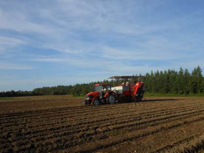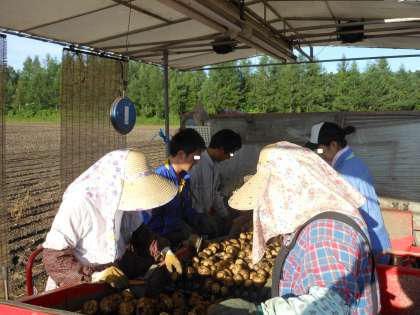 下の写真も十勝地方のある農場での収穫風景です。1つの農家だけで経営しています。ほぼ家族・親戚とパートさんでやっています。