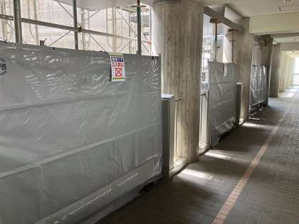 校舎の長寿命化工事も着々とすすみ、校舎中庭側には足場が組まれシートも掛けられています。現在校舎北側および東側の壁面に足場が組まれ、来週にはグランド側及び西側に足場が組まれていきます。校舎内の廊下は少し暗いです。
